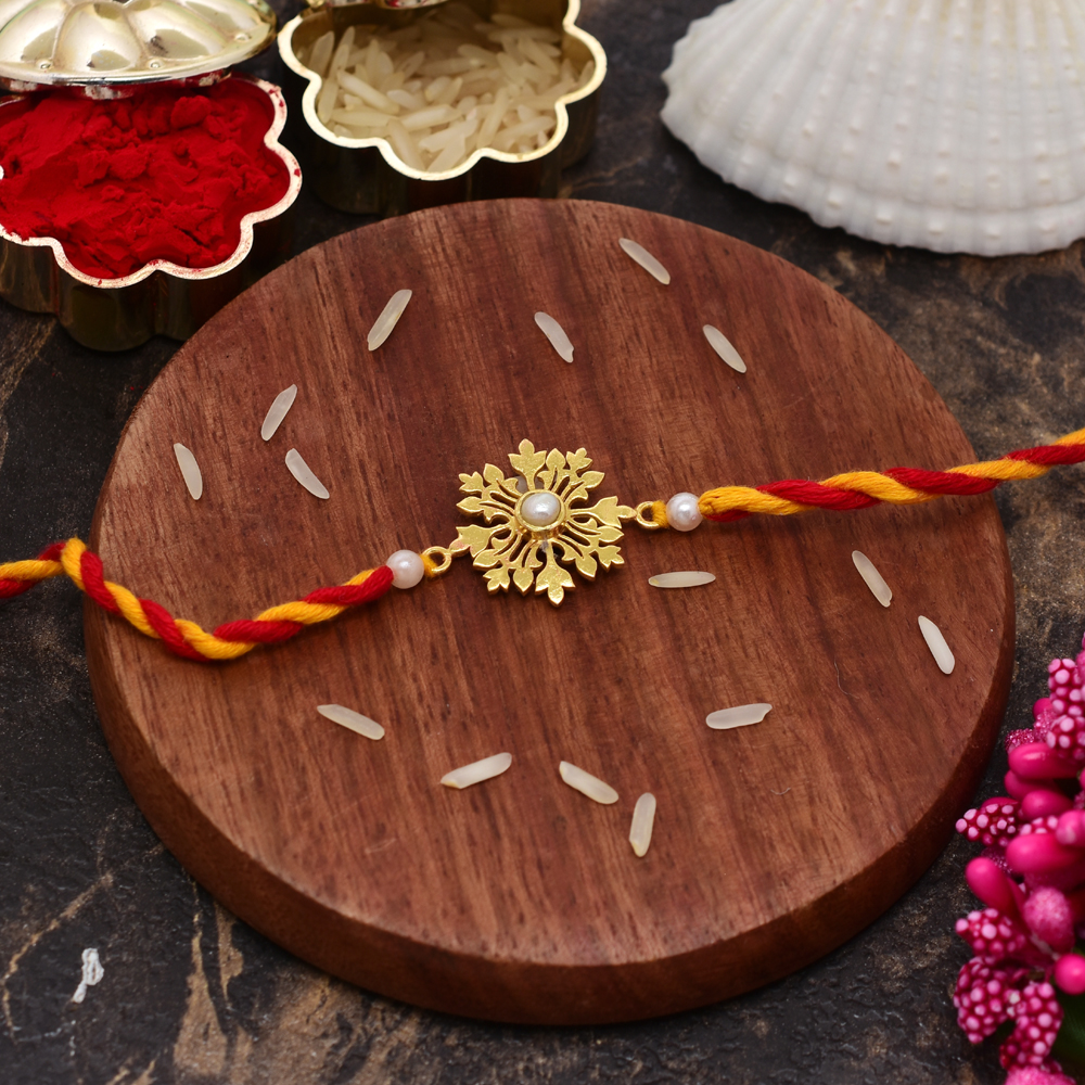 A silver pearl flower rakhi is a beautiful and refined choice for Raksha Bandhan. . Later the center motif can be used for making a Pendant by changing the thread.