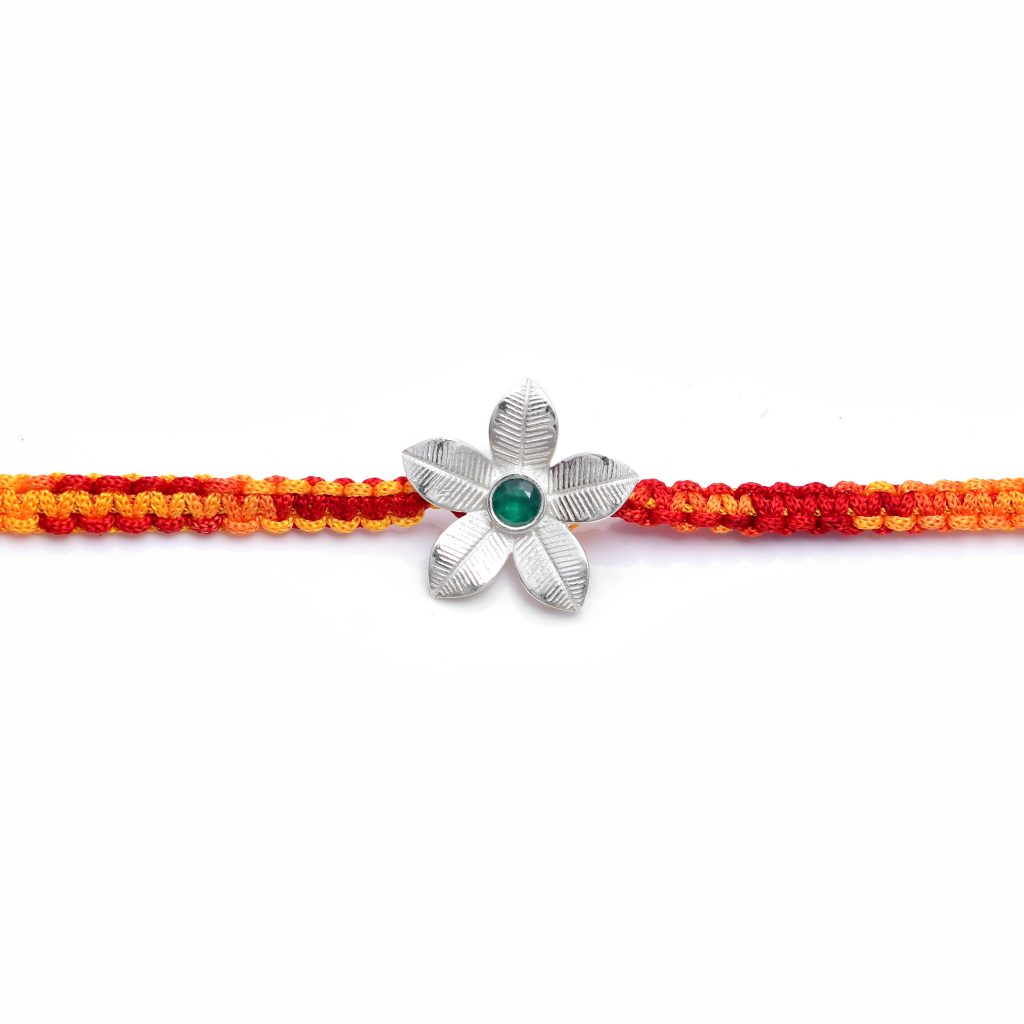 Celebrate the bond of love and protection with a stunning silver flower stone rakhi. This unique and elegant rakhi is perfect for expressing your affection towards your brother on Raksha Bandhan. The intricate design of the silver flower, adorned with sparkling stone, adds a touch of glamour to this traditional festival. The center motif can be used for making a Pendant by changing the thread.