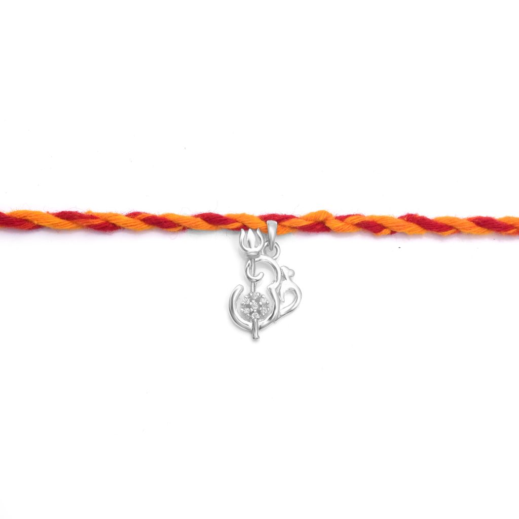 The rakhi features Om and trident a powerful symbol associated with Lord Shiva, representing divine protection, power, and destruction of evil.The center motif can be used for making a Pendant by changing the thread.