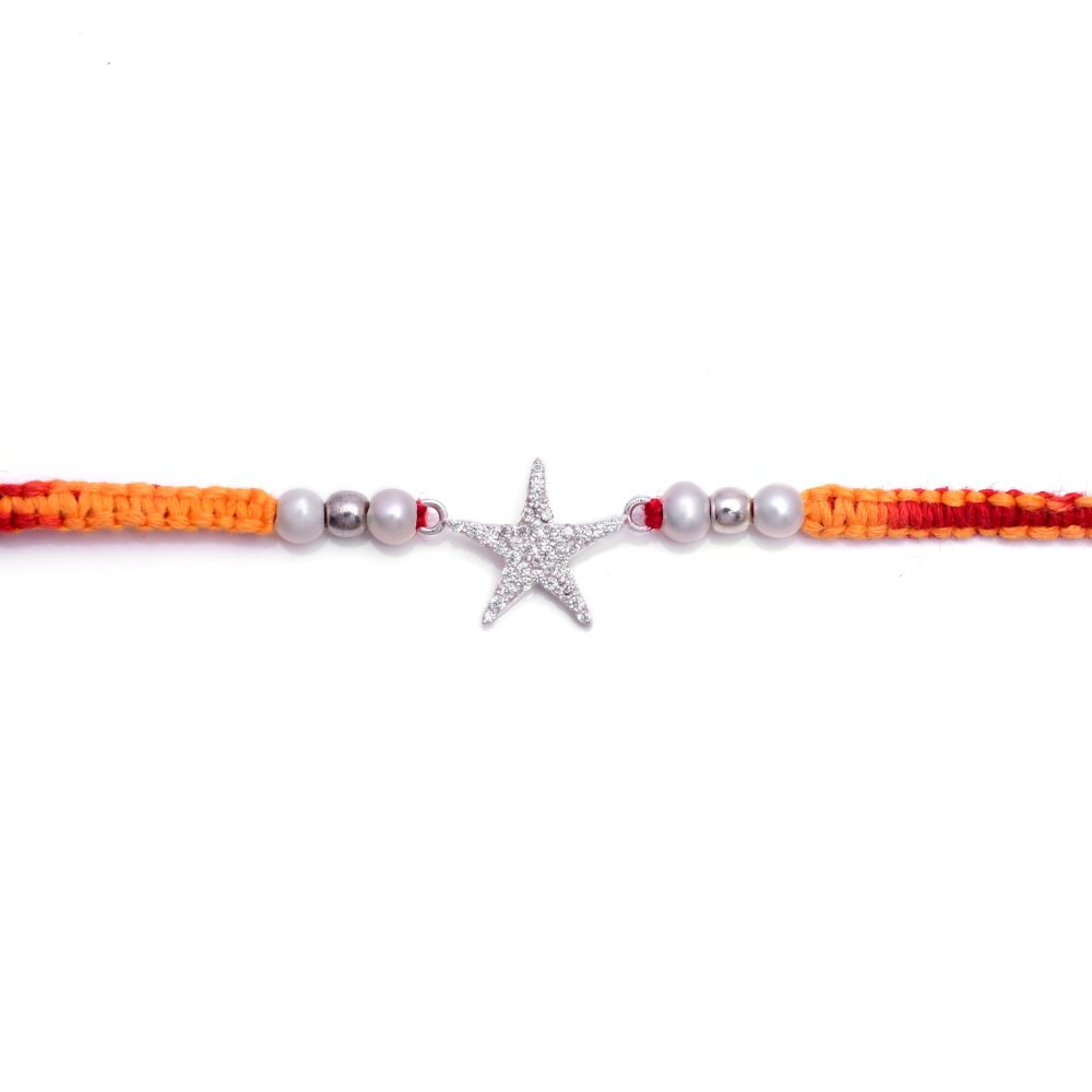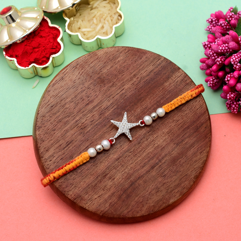 This silver rakhi a star symbol.The Silver Stone Sparkling Star Rakhi is inspired by the celestial charm. Make this a witness of cherished moments this Rakhi.