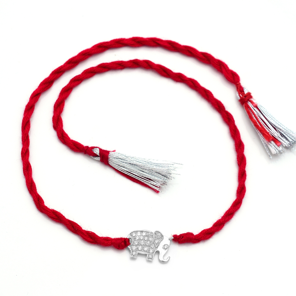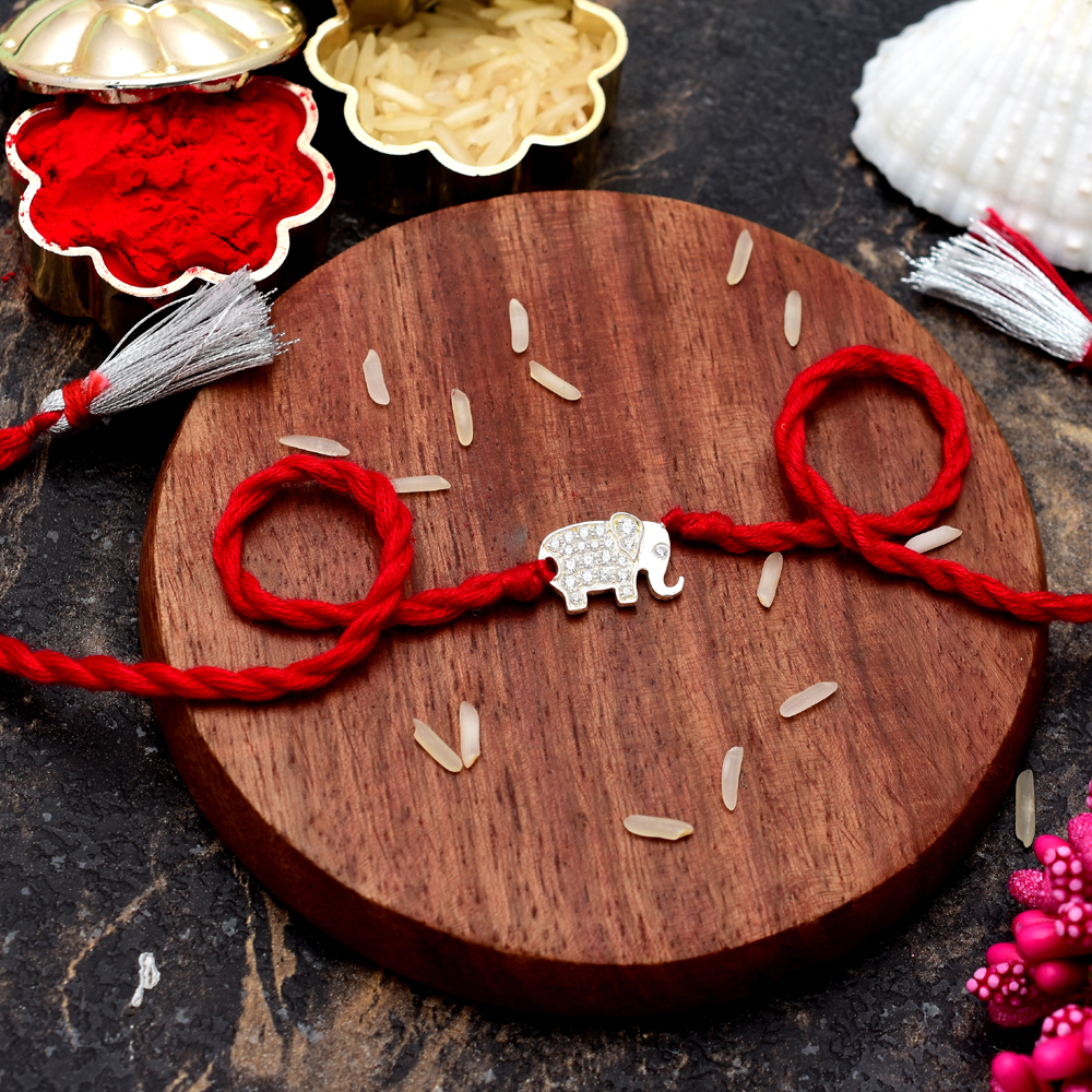 The Silver Stone Elephant Rakhi is a charming and unique piece, perfect for the festival of Raksha Bandhan. This rakhi features a small, designed silver elephant adorned with sparkling stones. Later the center motif can be used for making a Pendant by changing the thread.