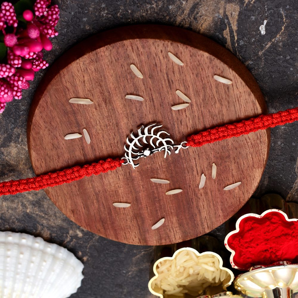 This rakhi’s intricate detailing captures the delicate and vibrant essence of the peacock feather,