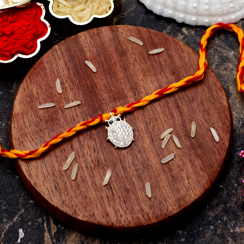 The rakhi features a beetle motif crafted from sterling silver, symbolizing transformation, resilience, and protection. . Later the center motif can be used for making a Pendant by changing the thread.