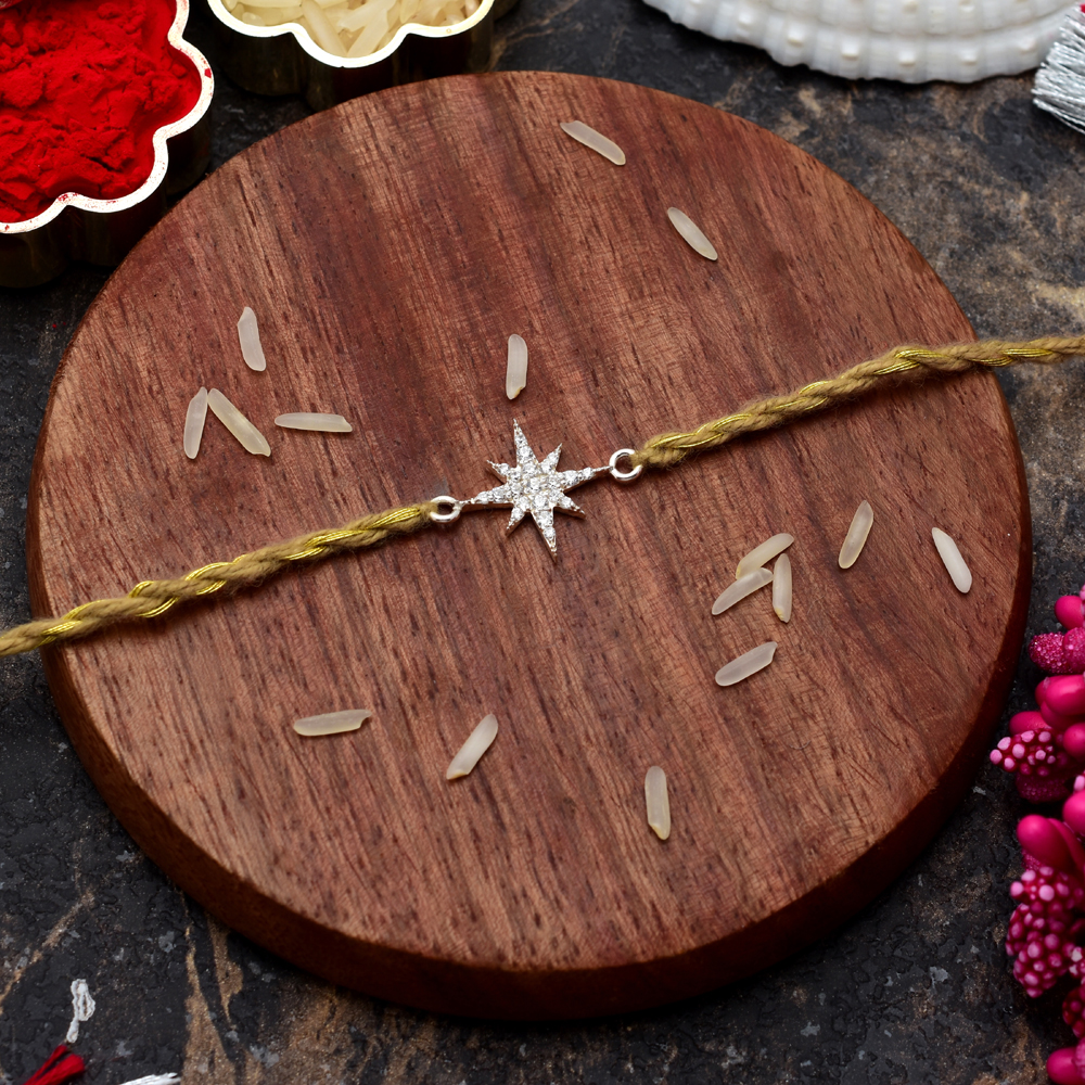 Make this Raksha Bandhan truly memorable with the silver starburst rakhi. Let your brother know how much he means to you by tying this beautiful symbol of love and protection on his wrist. Celebrate your bond in style with this elegant and meaningful rakhi that is sure to be cherished for years to come.